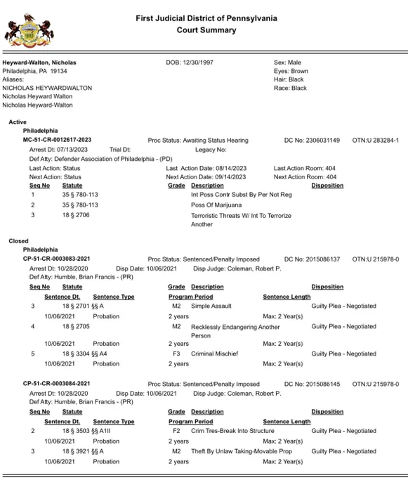 You know what else the newspaper didn’t include? Mr Heyward-Walton’s rap sheet! This fine young gentleman was already out on bond for crimes including terroristic threats, PA 18 §2706, which, depending on circumstances, is either first degree misdemeanor or third degree felony. He was released on August 14th on that one.